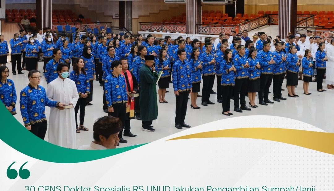 MANGUPURA, lintasbali.com – Universitas Udayana menggelar Upacara Pengambilan Sumpah/Janji Pegawai Negeri Sipil (KIC) diselenggarakan di Gedung Auditorium Widya Sabha Universitas Udayana pada Rabu, 3 Mei 2023 yang dihadiri langsung oleh Plt Direktur Utama RS UNUD dr. I Wayan Aryabiantara, Sp dan diikuti seluruh CPNS di lingkungan Universitas Udayana dan sebanyak 30 CPNS Dokter Spesialis di Rumah Sakit Universitas Udayana.