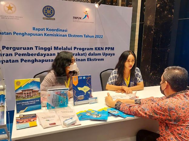Rakor akan berlangsung selama 2 (dua) hari, 31 Agustus – 2 September 2022. Terdapat 6 (enam) Booth pada Rakor Percepatan Penghapusan Kemiskinan Ekstrem tahun 2022, yaitu dari: Universitas Udayana, Satgas data P3KE (Kemenko PMK), TNP2K dan TP2S (stunting), Kemendagri, Pemprov Jatim, dan Pemprov Jateng. Pada hari pertama ini, booth pameran LPPM Unud sudah ramai dikunjungi oleh unsur Pemerintah Daerah, yaitu Wakil Gubernur Lampung, Bappeda Riau, Bappeda Kalimantan Tengah, Bappeda NTB, Bappeda DIY dan Kedutaan Besar Australia.