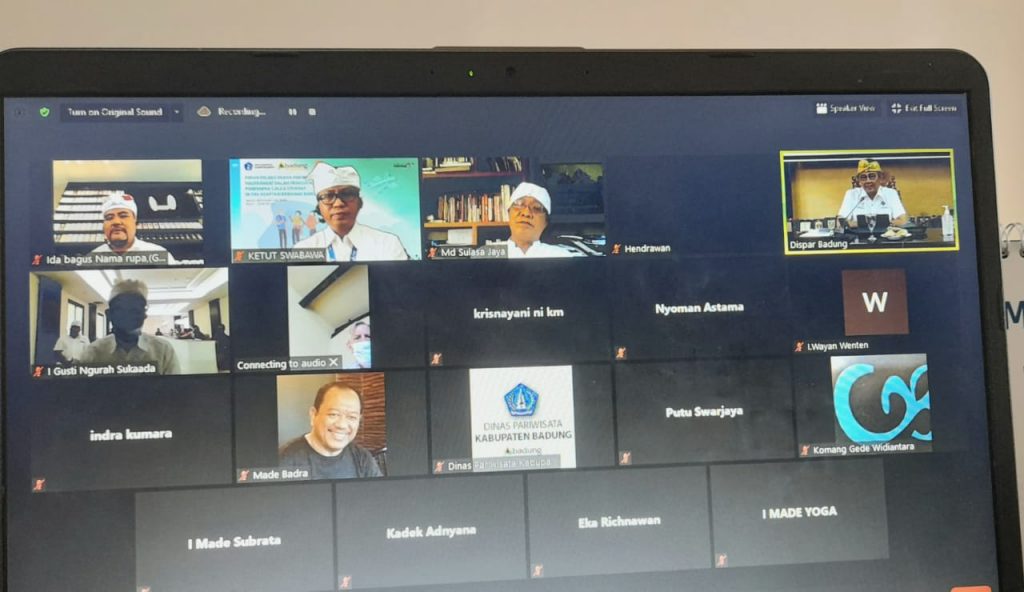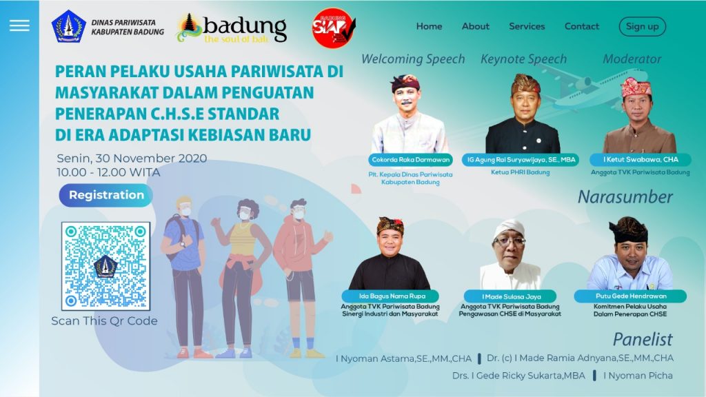 Webinar yang menghadirkan tiga narasumber dari tim verifikasi Dinas Pariwisata Kab Badung yaitu IB Gede Namarupa, Made Sulasajaya dan Putu Gede Hendrawan membahas masing-masing tentang sinergitas industri dan masyarakat, pengawasan dan pembinaan penerapan CHSE dan komitmen pelaku usaha di masyarakat.