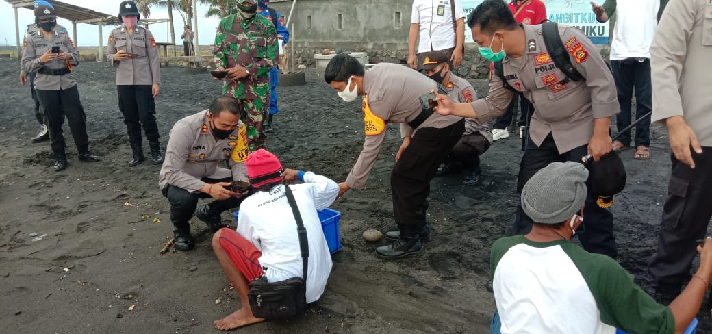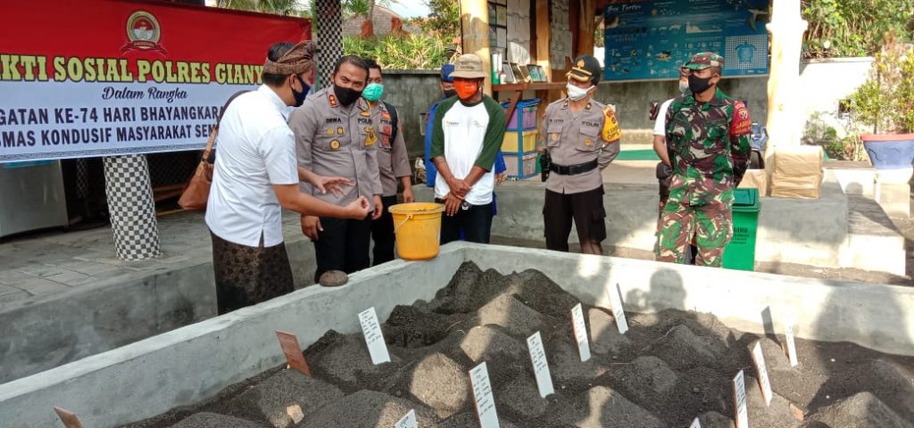 Dalam rangka Bakti sosial peringatan ke -74 hari Bhayangkara Polres Gianyar peduli akan lingkungan, yang dipimpin langsung Kapolres Gianyar AKBP I Dewa Made Adnyana, S.I.K., S.H., M.H., yang didampingi Waka Kompol Pius X Febry Aceng Loda, S.I.K., M.H., dan Kabag Ops Kompol I Wayan Latra, S.H,, M.H., Kabag Sumda Kompol I Ketut Dana, S.H., Kepala Seksi Wilayah II Bali BKSDA Sulistyo Widodo beserta anggota dari jajaran Sat Polair Polres Gianyar, mengunjungi tempat penangkaran penyu sekaligus penanaman telur penyu dan melepas tukik di pantai Saba sebanyak 74 ekor, Kamis 18/6/20