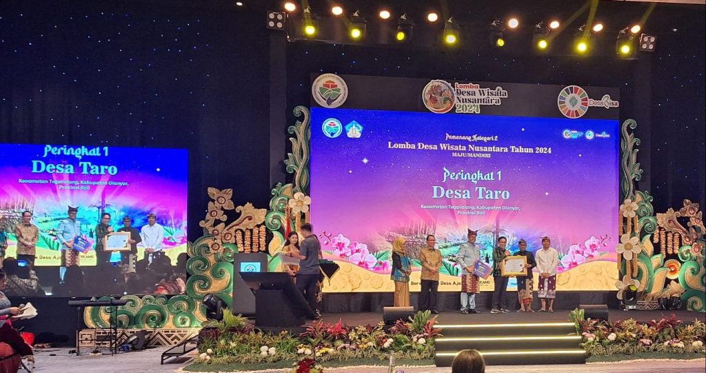 Akhirnya Desa Wisata Taro berhasil meraih Juara 1 kategori desa maju dan mandiri untuk tahun ini. Pada kesempatan tersebut, Kepala Desa Taro, I Wayan Warka yang hadir langsung di acara pengumuman dan penganugerahan tersebut menyampaikan rasa haru dan bangganya.