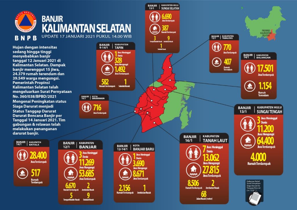 Pemerintah Provinsi Kalimantan Selatan telah menetapkan Status Tanggap Darurat Bencana Banjir pada Tanggal 14 Januari 2021. Sampai saat ini BPBD juga melakukan pendataan titik pengungsian bagi masyarakat terdampak.