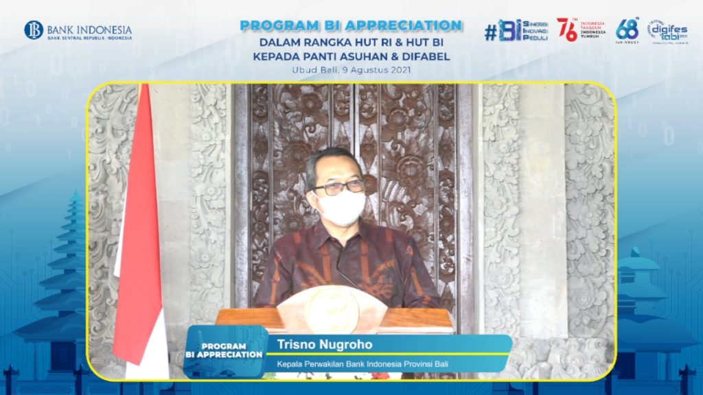 Mengawali sambutannya, Trisno menyampaikan bahwa kegiatan penyerahan PSBI ini merupakan rangkaian acara Peringatan Hari Ulang Tahun (HUT) Bank Indonesia ke-68 dan HUT Republik Indonesia ke-76. Bantuan kepada Yayasan Bhakti Senang Hati dan Yayasan Cahaya Mutiara sebagai bentuk dukungan Bank Indonesia dalam memelihara dan mendorong kepedulian sosial di Provinsi Bali.