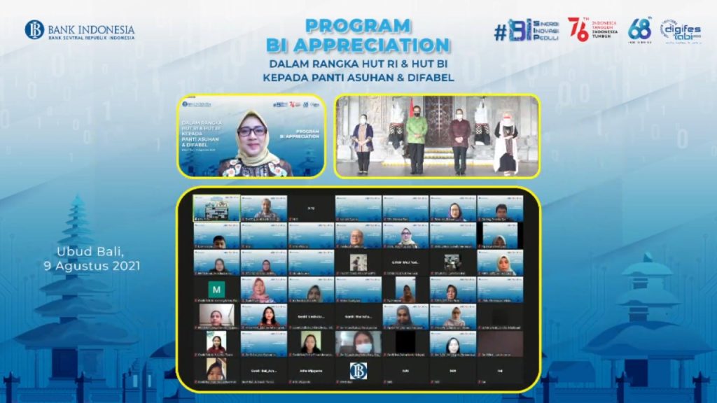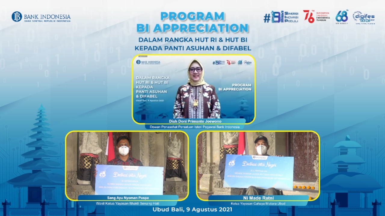 Bantuan diserahkan secara virtual oleh Anggota Dewan Penasehat Persatuan Istri Pegawai Bank Indonesia (PIPEBI), Diah Doni P. Joewono kepada Wakil Ketua Yayasan Bhakti Senang Hati, Sang Ayu Nyoman Puspa dan Ketua Yayasan Cahaya Mutiara Ubud, Ni Made Ratni.