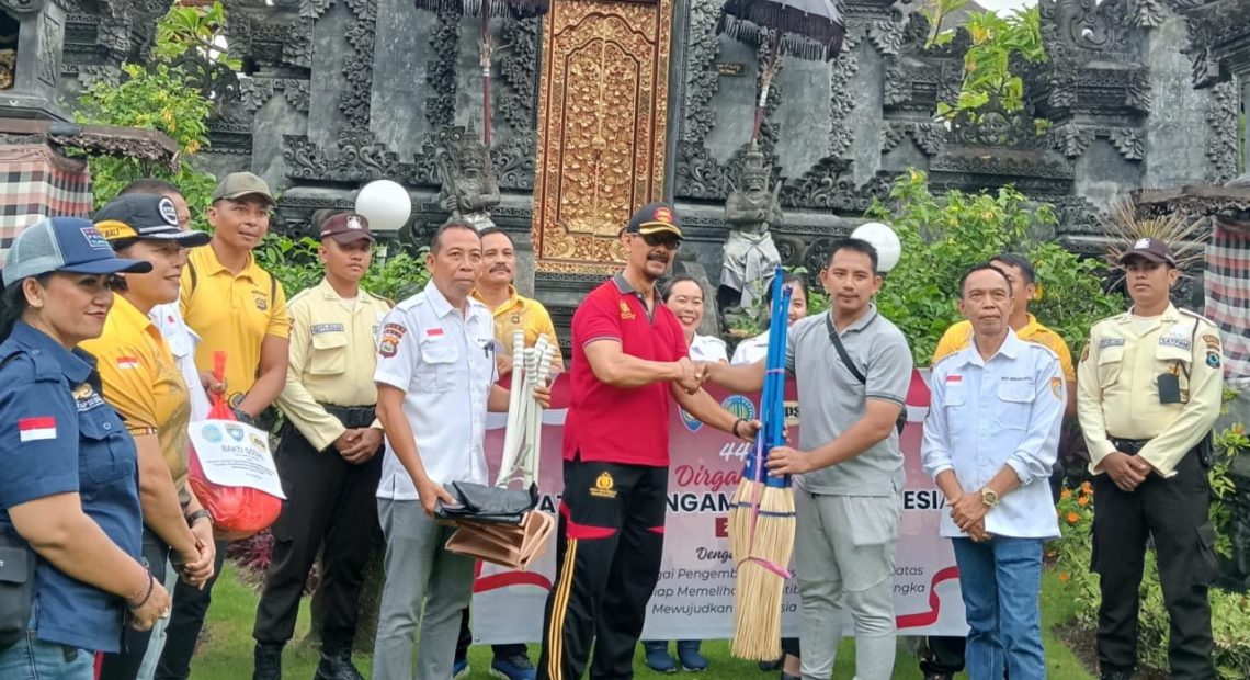 Setelah melakukan aksi bersih-bersih dilanjutkan menyerahkan bantuan paket sembako dan alat kebersihan kepada pengelola tempat suci tersebut.