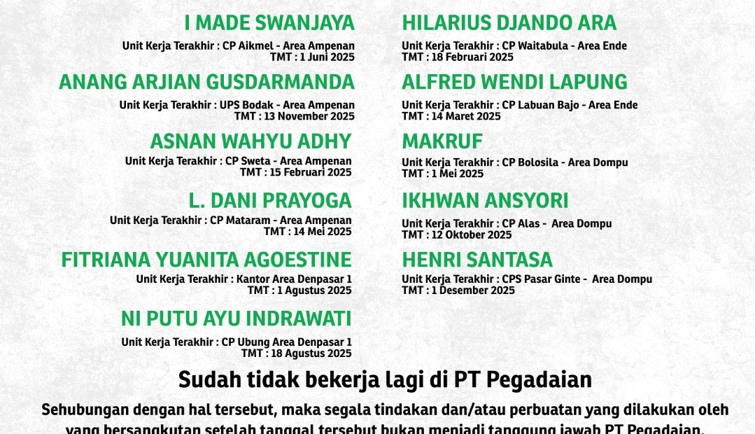 News Breaking News! Pemberitahuan PT Pegadaian Kanwil Denpasar Kepada Masyarakat Pemberitahuan PT Pegadaian Kanwil Denpasar Kepada Masyarakat BACA JUGA: Perayaan World Veterinary Day di Universitas Udayana Bali Tags: PT Pegadaian Kanwil VII Denpasar Post navigation Previous Previous post: BRI Region 17 Denpasar Siapkan Layanan Penukaran Uang Kartal Ramadan dan Idulfitri 2026 di Seluruh BaliNext Next post: Polda Bali Buru Enam Tersangka Penculikan WNA Ukraina, Ajukan Red Notice ke Interpol