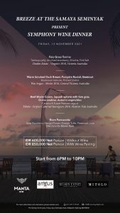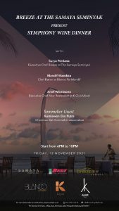 Breeze at The Samaya Seminyak mempersembahkan “Symphony Wine Dinner” yang akan berlangsung pada hari Jumat tanggal 12 November 2021 dimulai pukul 18:00 WITA.