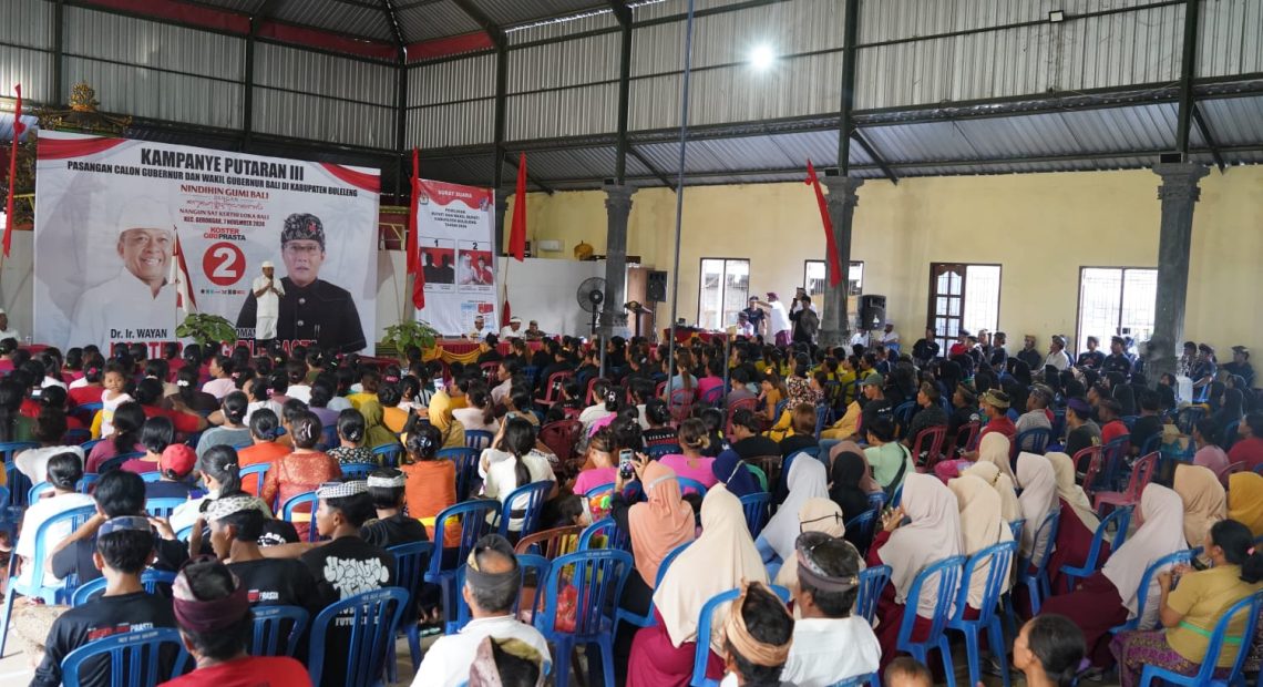 ‘Pak Wayan yang membuat desa adat di Bali ajeg. Kita fokus ke Pak Wayan dan Pak Giri untuk provinsi Bali dan Joss 24 untuk Buleleng. Ini paketan yang harus dimenangkan,” lanjut warga.