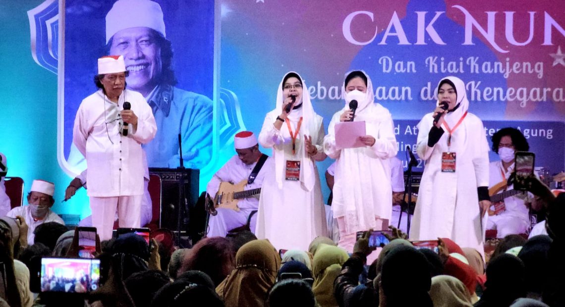 Cak Nun bersama Puan melantunkan sejumlah lagu dari atas panggung, mulai dari lagu Tanah Air karya Ibu Soed, sejumlah lagu daerah, hingga lagu Imagine karya John Lennon.