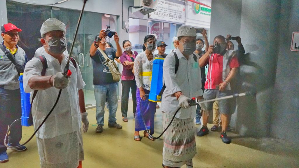 Seperti yang dilakukan Walikota Denpasar, IB. Rai Dharmawijaya Mantra yang secara langsung memimpin melakukan penyemprotan disinfektan di Pasar Badung, Minggu (15/3). Rai Mantra yang didamping Sekda AAN. Rai Iswara mengatakan bahwa Pemkot Denpasar sejak seminggu lalu secara berkelanjutan terus memaksimalkan langkah preventif guna mencegah penyebaran virus corona ini. Beragam upaya telah dimaksimalkan, seperti halnya sosialisasi yang dilaksanakan dengan menggandeng Desa/Lurah hingga ke banjar-banjar. Pengecekan Suhu Tubuh dan penyediaan Sanitizer di ruang publik, kantor, sarana transportasi siswa serta sekolah sekolah. Selain itu dengan penyemprotan cairan disinfektan dengan menyasar fasilitas/tempat umum di Kota Denpasar secara berkelanjutan.