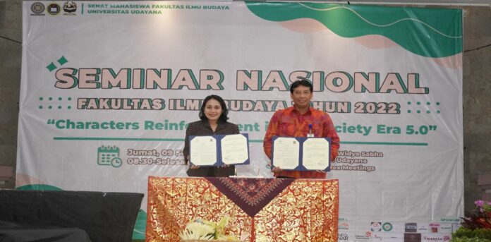 Denpasar – Senat Mahasiswa Fakultas Ilmu Budaya, Universitas Udayana selenggarakan Seminar Nasional dengan tema “Characters Reinforcement in the Society Era 5.0” secara hybrid di Auditorium Widya Sabha, Universitas Udayana, pada Jumat (9/9/2022).