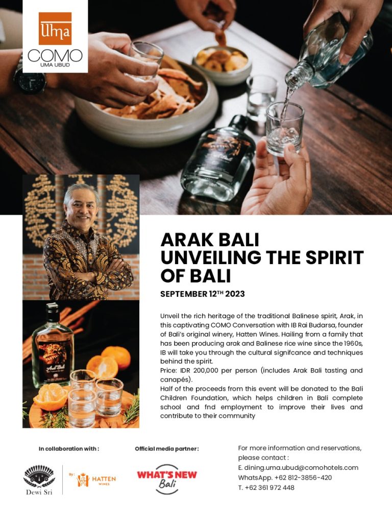 GIANYAR, lintasbali.com – Dengan bangga Uma Como Uma Ubud akan menggelar sebuah acara bertajuk Nikmati obrolan santai dalam COMO Conversation yang akan menjelajahi Arak, warisan minuman tradisional asli Bali bertempat di Como Uma Ubud pada Selasa, 12 September 2023. COMO Conversation akan berkolaborasi dengan Arak Bali Dewi Sri dari Hatten Wines.