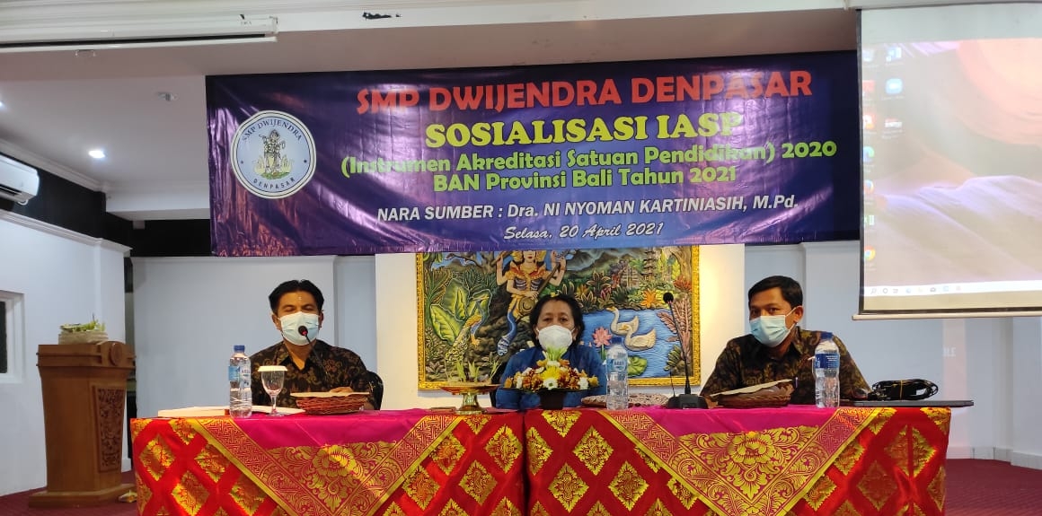 Sosialisasi IASP dipaparkan oleh Dra. Ni Nyoman Kartiniasih, M.Pd yang merupakan satu-satunya asesor jenjang SMP di BAN Provinsi Bali dalam akreditasi Sekolah. Dirinya mengatakan, dalam sosialisasi ini akan melibatkan seluruh Guru dan Karyawan SMP Dwijendra Denpasar.