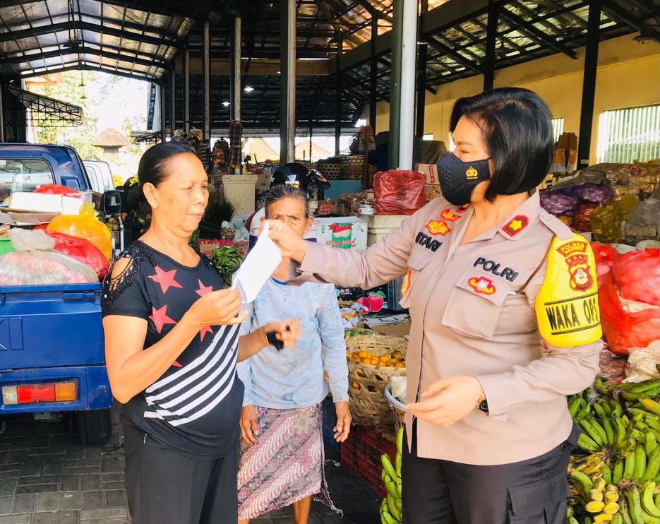 Hal tersebut disampaikan Wakil Kepala Kepolisian Resor (Wakapolres) Badung, Komisaris Polisi (Kompol) Ni Putu Utariani, SH saat membangikan ratusan masker di Pasar Dalung, Kecamatan Kuta Utara, Kabupaten Badung pada Minggu 15 Agustus 2021.