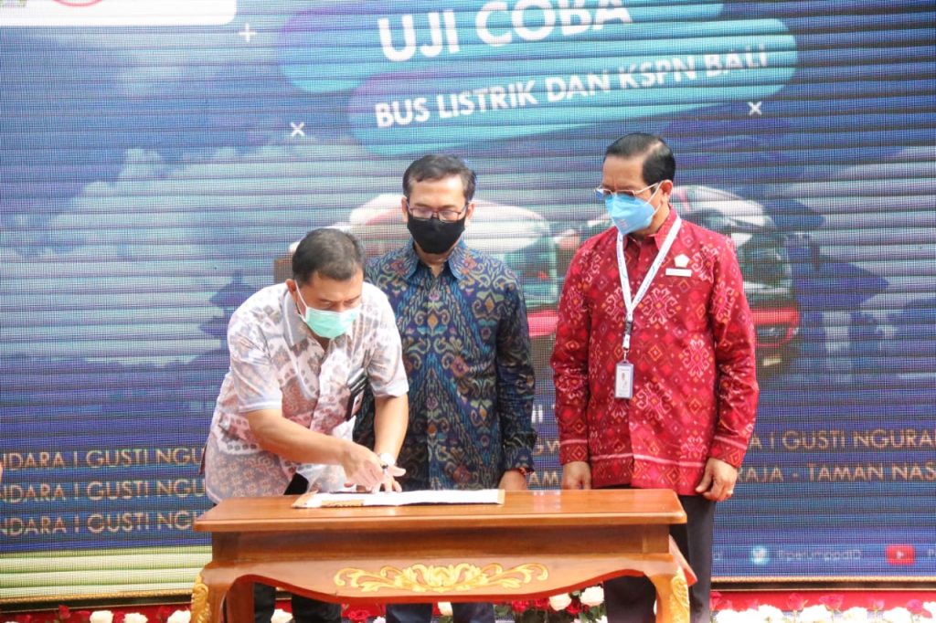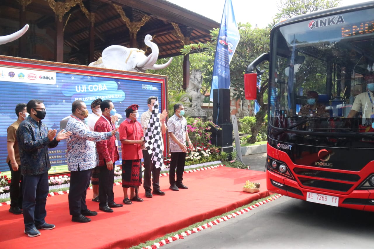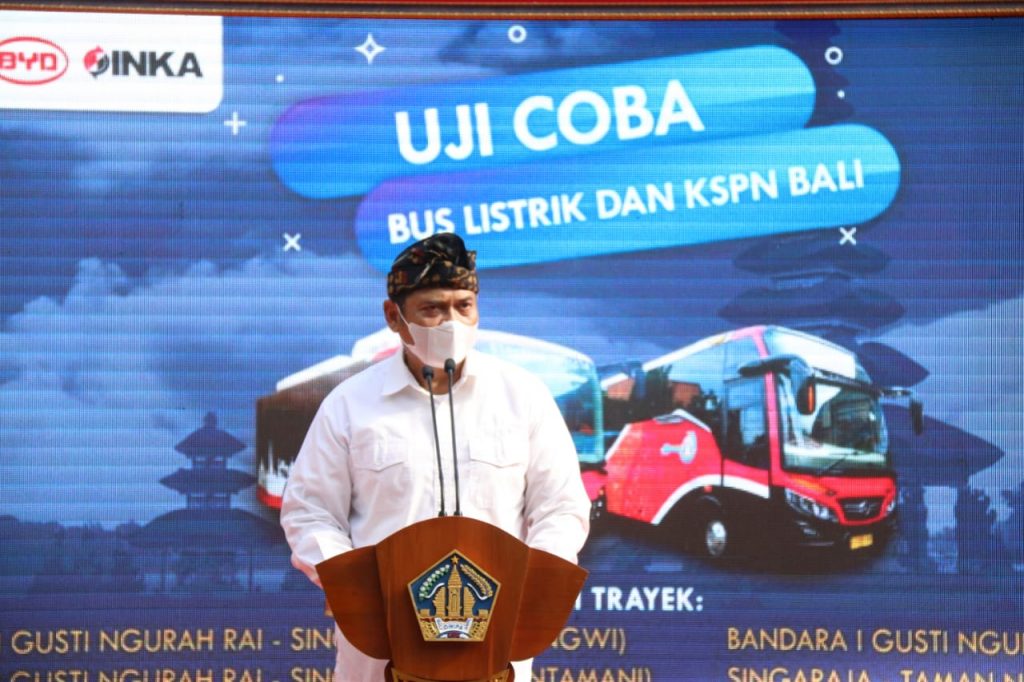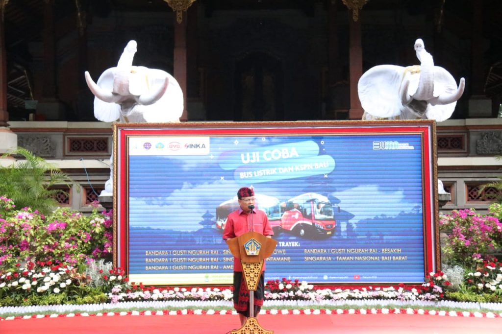 Denpasar, Lintasbali.com – Gubernur Bali Wayan Koster meluncurkan ujicoba layanan angkutan pada Kawasan Strategis Pariwisata Nasional (KSPN) dan ujicoba angkutan shuttle bus listrik untuk kawasan Kota Denpasar, Jumat (6/11) di Rumah Jabatan Gubernur Bali, Jayasabha, Denpasar.