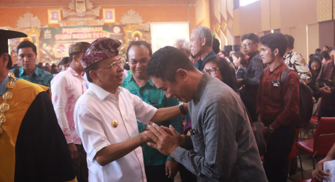 Komitmen Gubernur Koster ditunjukan dengan kehadirannya pada acara pengukuhan lima guru Besar tetap di Unmas Denpasar, Jumat 7 Maret 2025. Setelah pelantikan, Koster meluangkan waktu untuk menanam pohon di kawasan kampus sebagai wujud penghijaun di kawasan kota demi menjaga udara Bali tetap bersih. (Rls)