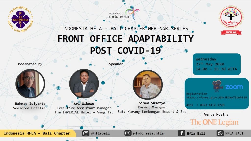 Webinar menghadirkan pembicara Ari Wibowo (EAM – The Emperial Hotel Bung Tau) dan Siswo Susetyo (Resort Manager Batu Karang Lembongan Resort & Spa) dengan topik Front Office Adaptability Post Covid-19. (Red/LB/Rls)