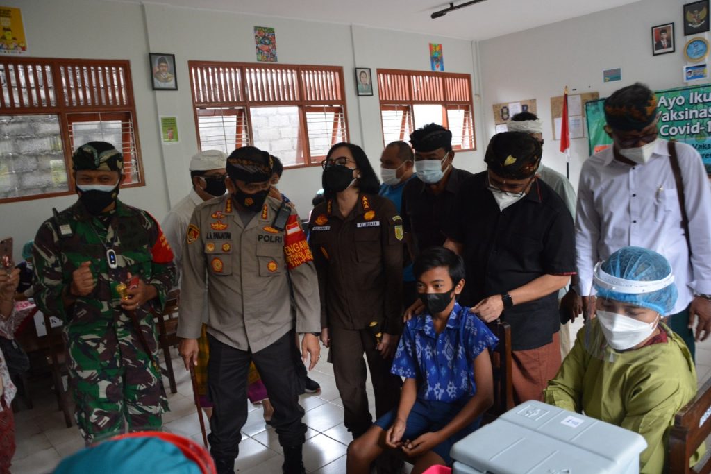 Jaya Negara bersama Forkopimda meninjau langsung pelaksanaan vaksinasi dan memberikan semangat kepada siswa serta mengajak untuk tetap disiplin prokes.