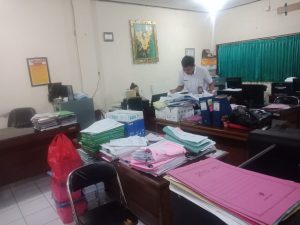 Tampak salah seorang petugas Dinas PMD Kota Denpasar lembur memeriksa berkas dari Desa/Dusun, Rabu (10/3/2021)