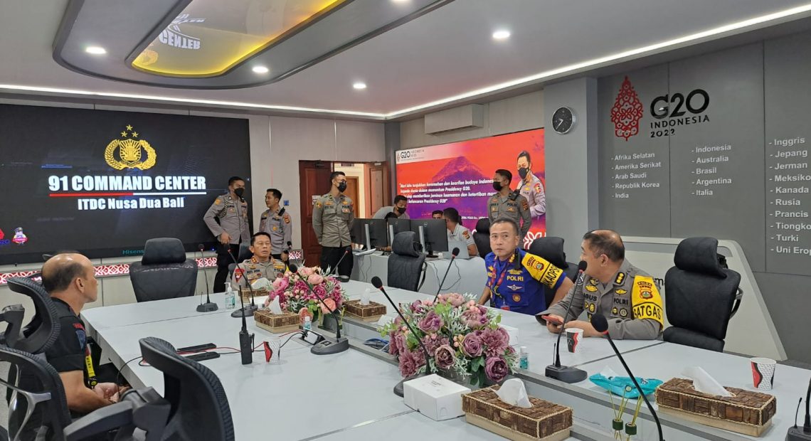 DENPASAR, lintasbali.com – Tak mau kecolongan pengamanan Ops Gapura Agung V 2022, dalam rangka pengamanan kegiatan 3rd Finance And Central Bank Deputies Meeting (FCBD) & 3rd Finance Ministers And Cetral Bank Goverment Meeting (FMCBG), Kapolda Bali Irjen Pol Putu Jayan Danu Putra S.H., M.Si., pantau langsung pengamanan unjuk rasa di renon melalui Comand Center Polda Bali ITDC Nusadua, pada kamis 14 juli 2022.