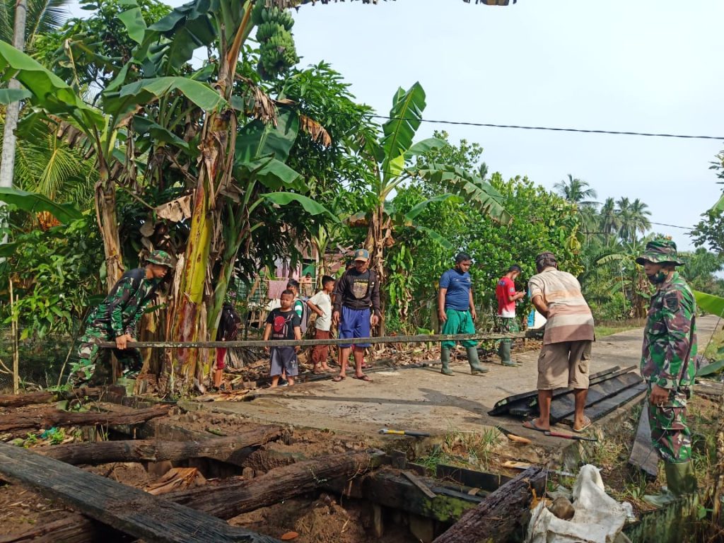Masyarakat dan prajurit TNI bahu-membahu memperbaiki jembatan yang menjadi salah satu sasaran fisik TMMD Reguler ke-109 di Desa Bapinang Hilir dan Babirah