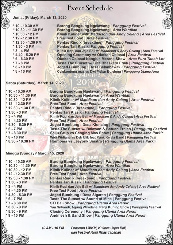 Selain itu Tanah Lot Art and Food Festival #3 tahun ini juga akan memanjakan pengunjung dengan menghadirkan “KLINIK KOPI DAN KULINER” sebagai salah satu ikon event lainnya, yang akan memberikan ruang para wisatawan dan masyarakat umum untuk secara lebih dalam mengenal Legenda Kuliner Tabanan yang telah mulal ditinggalkan, seperti Pepesan Telengis, Jukut Roroban, jaje leburan, Klepon dengan tema “Boga Ball Lawas”.