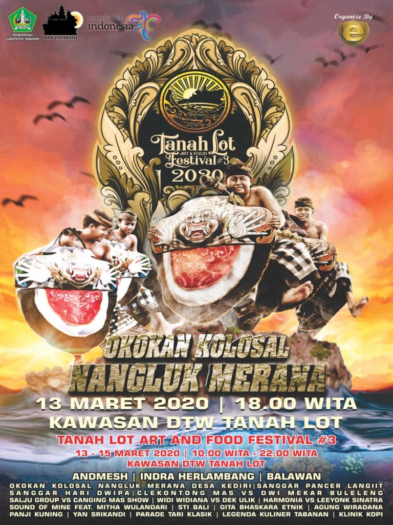 Dengan mengusung tema “TIRTA KAMANDALU” yang memilikl makna AIR SUCI DARI DASAR SAMUDRA YANG MENJADI SUMBER KEHIDUPAN, Tanah Lot Art and Food Festival #3 tahun Ini sekaligus sebagai moment Recovery dari efek mewabahnya kasus virus Covld-19 yang serta merta berdampak pada kehidupan pariwisata di Ball khususnya, melalui ikon Tanah Lot Art and Food Festival #3 “Pagelaran Okokan Kolosal” bertema “NANGLUK MERANA” yaitu sebuah pertunjukan tradisi yang pada umumnya digelar untuk mengusir bala atau musibah, seperti penyakit, hama , bencana dan sejenisnya, DTW Tanah Lot ingin menggaungkan harapan semoga Dunia segera mampu melepaskan diri dari wabah virus Corona.