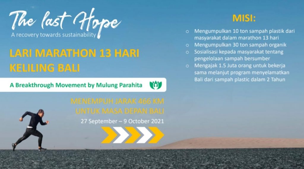 “The Last Hope merupakan kampanye kesadaran lingkungan yang akan dilakukan melalui lari marathon sejauh 466 kilometer selama 13 hari, sambil mengumpulkan sampah plastik 10 ton dan sampah organik 30 ton, kegiatan ini di dukung oleh Kemenparekraf,” jelasnya.