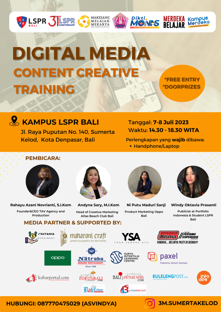 LSPR Institute of Communication & Business, salah satu Kampus dengan fakultas komunikasi dan bisnis terkemuka di Indonesia, terus menyebarkan semangat para pemuda pemudi dan kreativitas di Bali. Sebagai bentuk hormat terhadap wilayah dimana kampus ini berdiri, LSPR Bali akan turut ambil bagian dalam pengabdian kepada desa. Dalam kesempatan kali ini, mahasiswa LSPR Bali menggandeng Desa Sumerta Kelod menyasar Karang Taruna untuk meningkatkan kemampuan kreativitas mereka dalam menggunakan Media Kreatif dan Platform Digital.