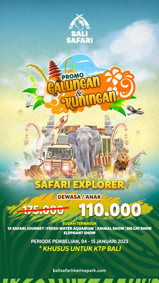 Ketut Suardana menyampaikan, Bali Safari memberikan harga promo selama periode Galungan dan Kuningan mulai 4-15 Januari 2023, ada promo khusus untuk dewasa dan anak pemegang KTP Bali. Cukup membayar Rp110.000,-/orang untuk pembelian tiket masuk. Harga ini sudah termasuk 1 kali Safari Journey, Fresh Water Aquarium, Animal Show, Big Cat Show, dan Elephant Show.