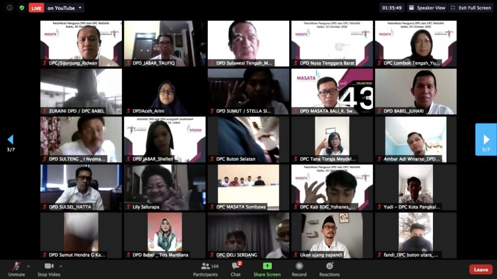 Jakarta, Lintasbali.com – Sebagai upaya pemberdayaan masyarakat dan potensi pariwisata di daerah terutama di masa pandemi COVID-19 ini, Pengurus Pusat Masyarakat Sadar Wisata (MASATA) meresmikan sekaligus melantik pengurus DPD dan DPC di seluruh Indonesia, Sabtu (4/10) secara online dan serentak.