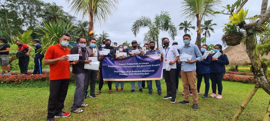 GIANYAR, Lintasbali.com – Masyarakat Sadar Wisata (MASATA) wilayah Bali berkesempatan menyampaikan bantuan Kementerian Pariwisata dan Ekonomi Kreatif Republik Indonesia berupa hand sanitizer dan masker bagi pelaku pariwisata di Desa Wisata Taro, Kecamatan Tegallalang Kabupaten Gianyar.