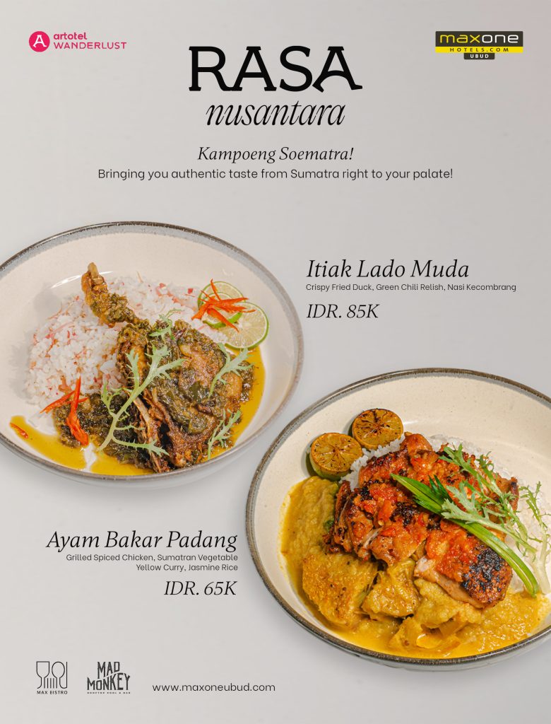 Untuk F&B, Artotel Wanderlust mengangkat hidangan lokal khas Sumatera dengan tema “Rasa Nusantara – Kampoeng Soematra”, yang dapat dinikmati oleh para tamu di semua hotel, seperti yang tersedia di Maxone Hotel Ubud dengan beberapa pilihan menu: