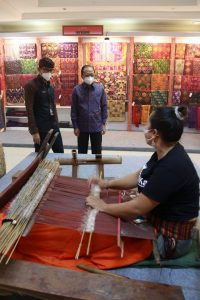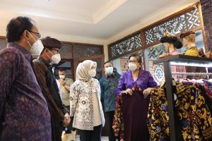 Kepada Menteri Sandiaga Uno, Ny Putri Koster menunjukkan sebuah busana berbahan bordir motif songket. “Seperti ini Pak Menteri, motif songket hasil bordir kita arahkan untuk bahan busana atasan,” terangnya.