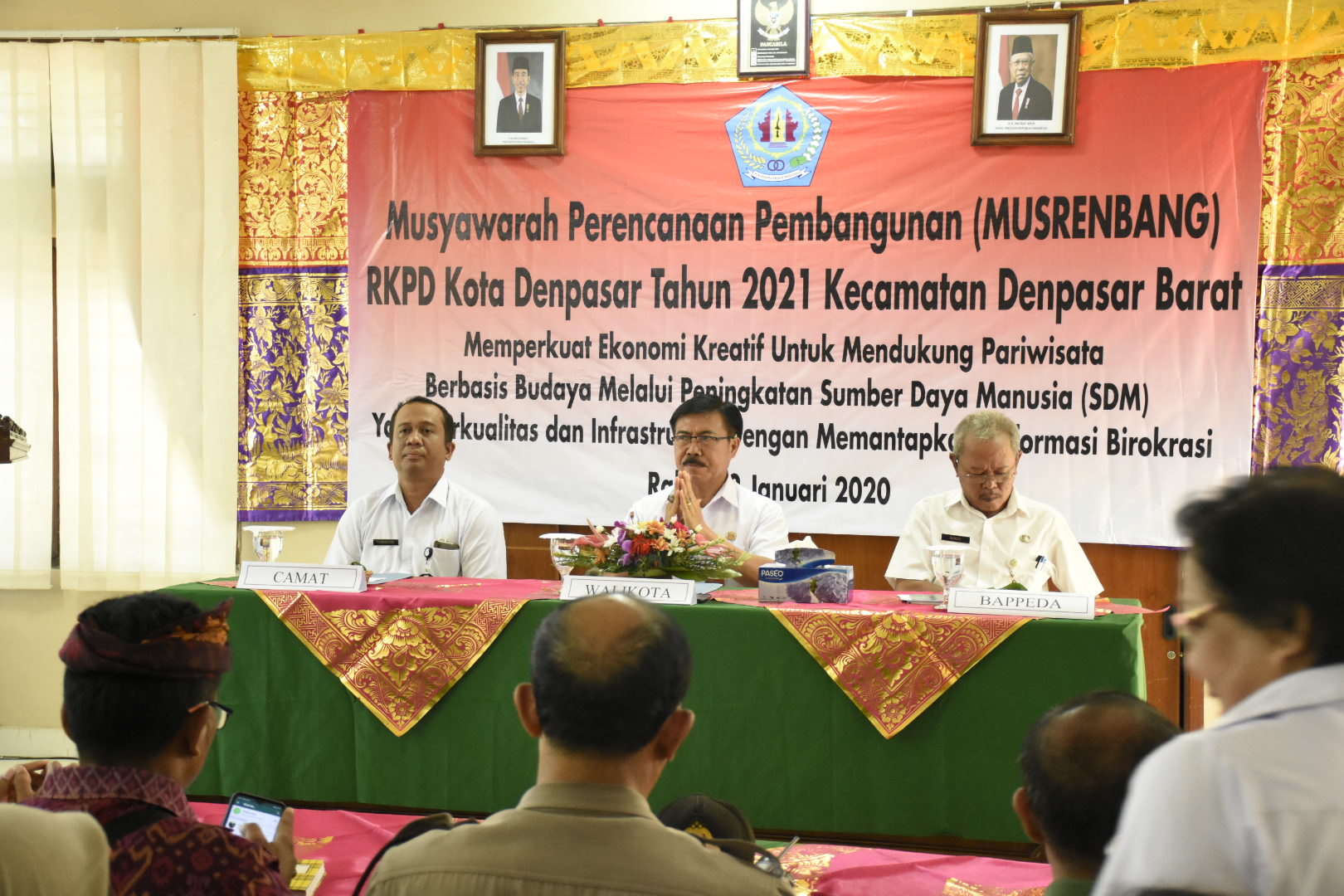 Walikota Denpasar, I.B Rai Dharmawijaya Mantra dalam sambutannya yang dibacakan Camat Denpasar Barat, AAN. Made Wijaya mengatakan dalam penyusunan Dokumen Rencana Pembangunan patut diketahui diwilayah instansi pemerintahan dan masyarakat yang melaksanakan pembangunan berdasarkan Musyawarah Perencanaan Pembangunan (Musrenbang) khususnya Musrenbang RKPD Tahun 2021 Kota Denpasar yang dilaksanakan di Kecamatan Denpasar Barat.
