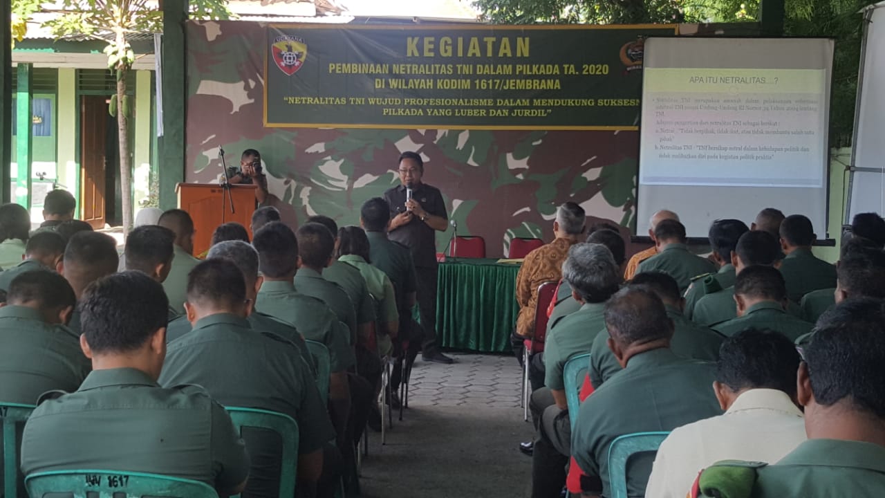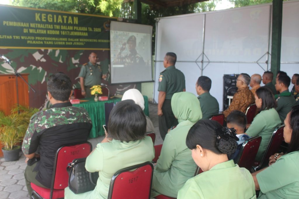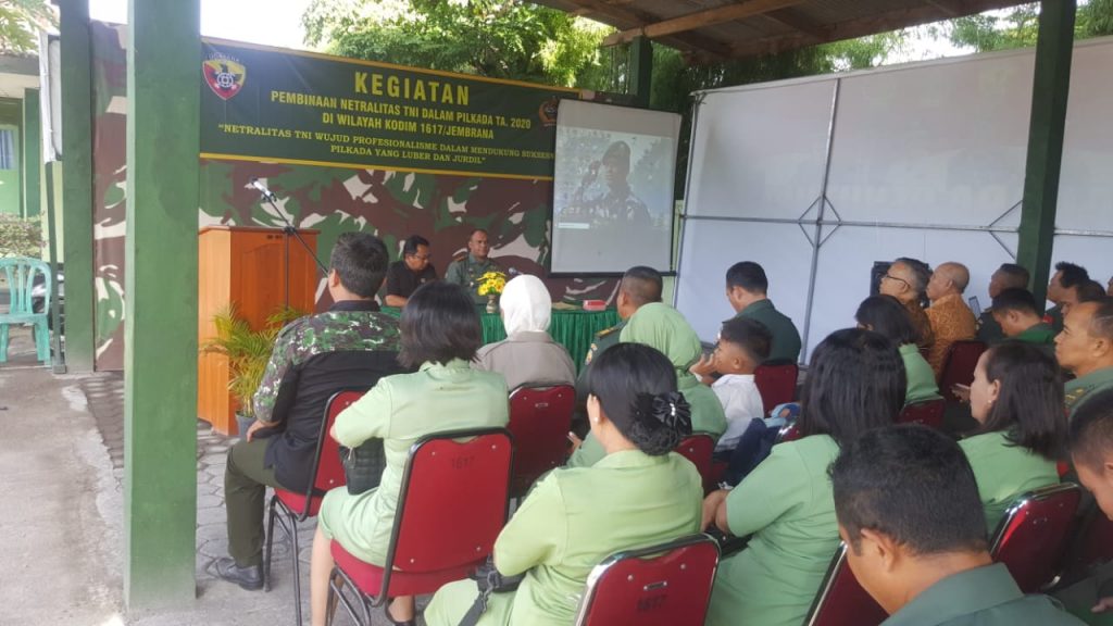 Hal tersebut ditegaskan Dandim 1617/Jembrana Letkol Kav Djefri Marsono Hanok bertempat di Garasi Makodim 1617/Jembrana, Jalan Ngurah Rai No.135, Kelurahan Dauhwaru, Jembrana dalam kegiatan Pembinaan Netralitas TNI Dalam Pilkada Tahun 2020 di Wilayah Kodim 1617/Jembrana pada hari Selasa (10/03/2020).