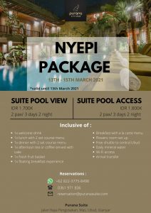 Jadi jangan pikir panjang lagi. Segera buat jadwal liburan anda dan pesan sekarang juga di Purana Suite Ubud. Dapatkan pengalaman Nyepi di Bali bersama sentuhan pelayanan terbaik dari Purana Suite Ubud. Tidak lupa tetap menjalankan protokol Kesehatan selama berada di hotel ini.