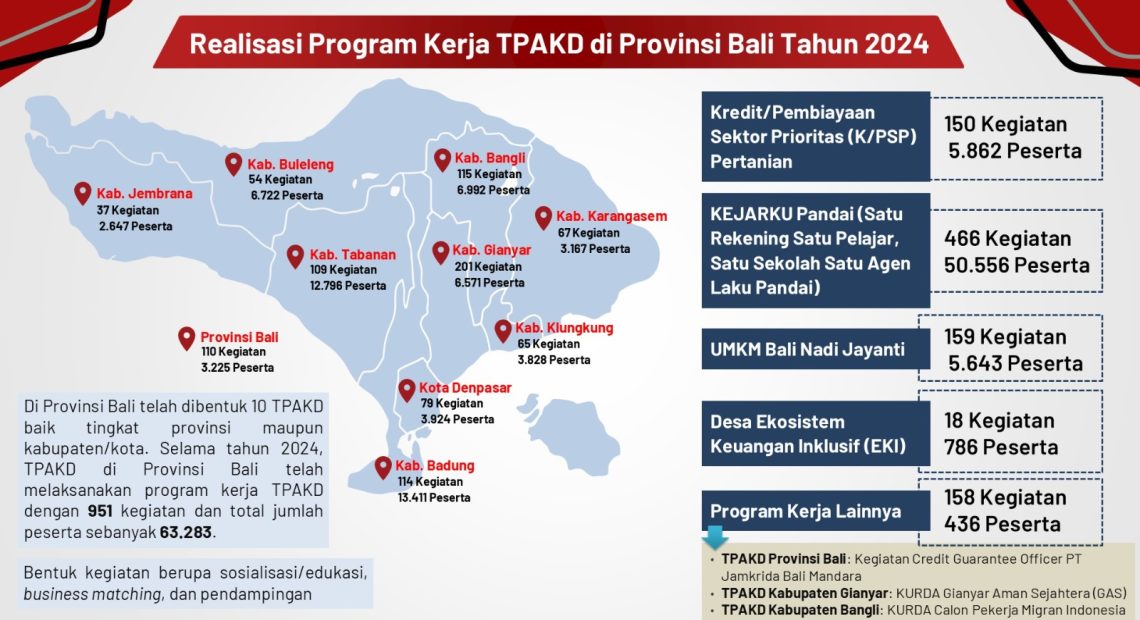 Sepanjang tahun 2024, 10 TPAKD di Provinsi Bali telah melaksanakan berbagai kegiatan peningkatan inklusi keuangan di Provinsi Bali 952 kegiatan dengan peserta kegiatan sebanyak 63.508 yang terdiri dari kelompok sasaran seperti petani untuk program K/PSP, pelaku UMKM untuk program UMKM Bali Nadi Jayanti, dan pelajar untuk program Kejarku Pandai.