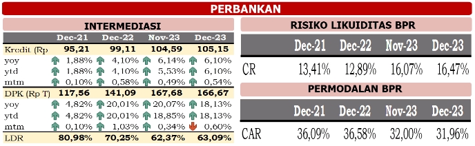 Fungsi intermediasi yang tercermin dari Loan to Deposit Ratio (LDR) posisi Desember 2023 sebesar 63,09 persen sedikit meningkat dibandingkan posisi November 2023 yang sebesar 62,37 persen (Desember 2022: 70,25 persen).