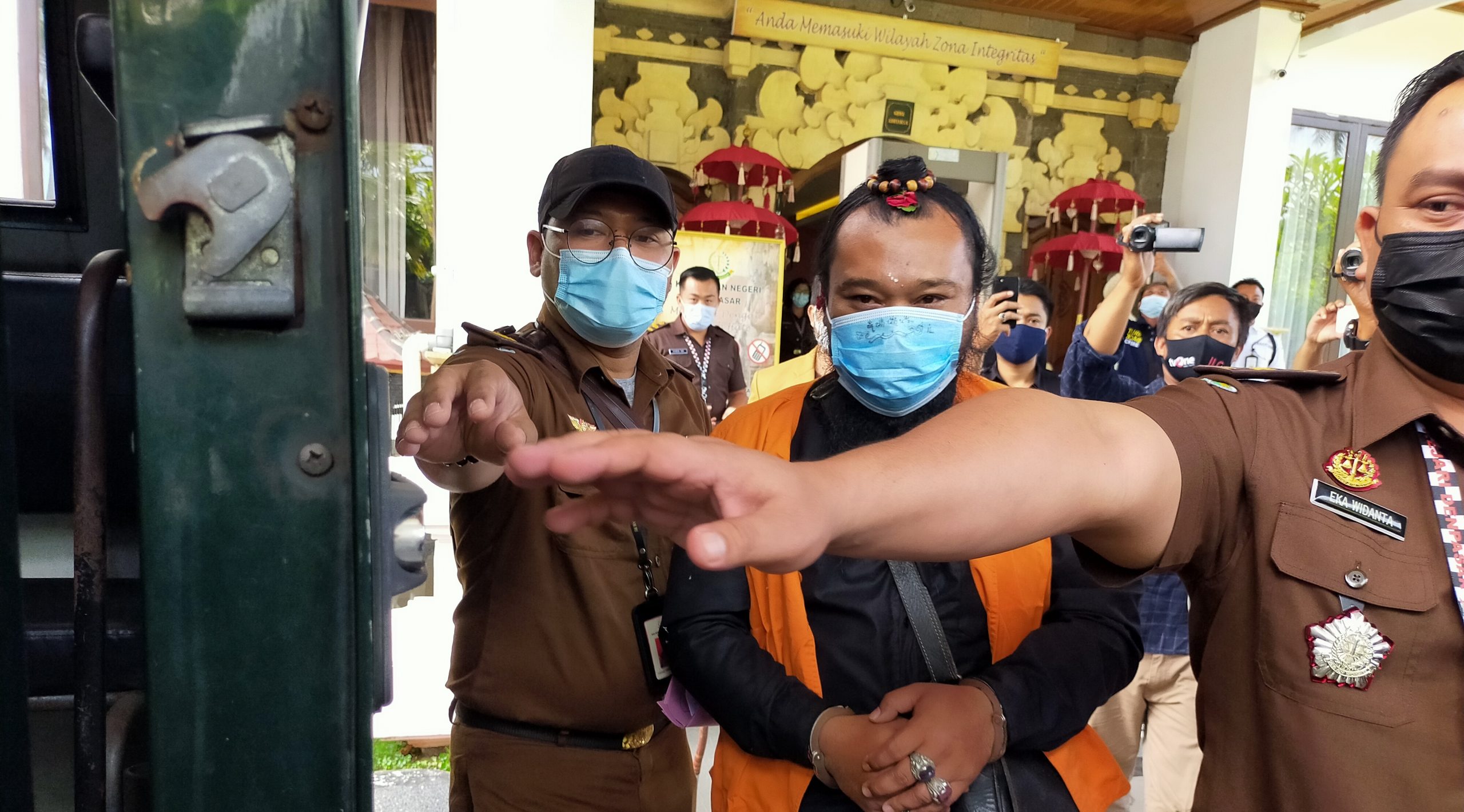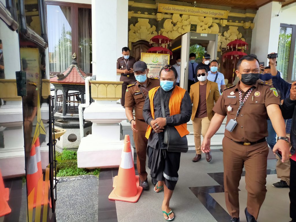 Oknum Sulinggih Kasus Pencabulan mengenakan rompi orange saat keluar dari Kejari Denpasar, Rabu (24/3/2021)