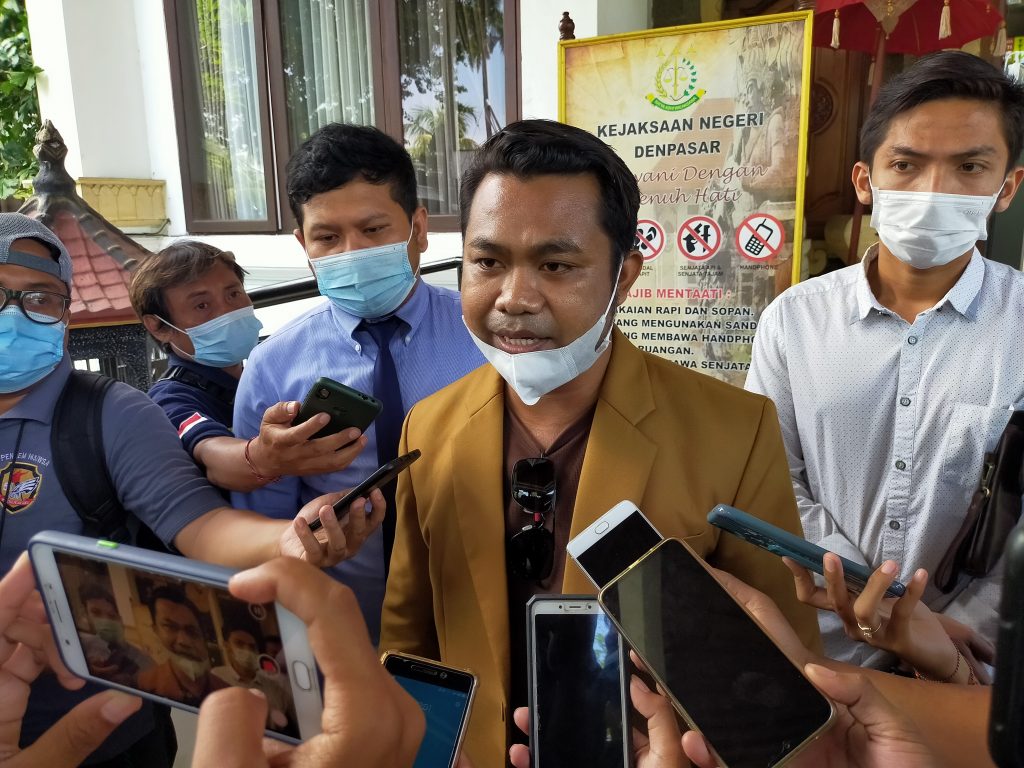 I Made Adi Seraya, SH., MH, Kuasa Hukum oknum Sulinggih IWM saat memberikan keterangan pers di Kejari Denpasar, Rabu (24/3/2021)