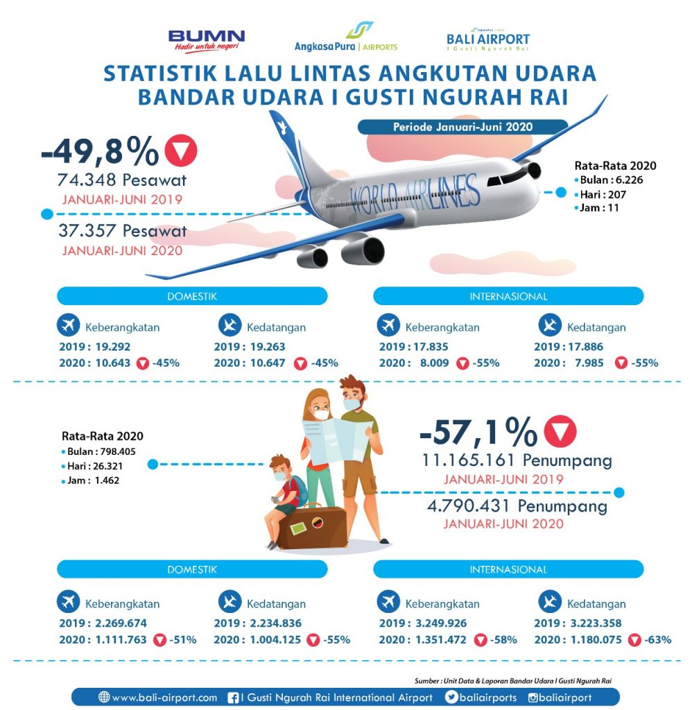 Dibandingkan dengan statistik pada periode yang sama di tahun 2019 lalu, tercatat jumlah penumpang serta jumlah pergerakan pesawat udara pada periode Januari hingga Juni 2020 ini mengalami penurunan yang cukup drastis. Pada semester pertama 2020, pintu gerbang Bali ini mencatat pergerakan penumpang sebanyak 4.790.431 penumpang, yang keluar masuk Pulau Bali melalui 37.357 pesawat udara.