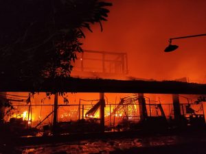 GIANYAR, lintasbali.com – Pasar Umum Blahbatuh di Kecamatan dilanda musibah kebakaran Selasa (15/6) sekitar pukul 17.30 Wita. Hingga pukul 19.43 Wita, api masih berkobar melahap hampir seluruh bangunan lantai 2. Sebanyak 602 kios maupun Los habis dilahap si jago merah. Belasan unit Mobil Pemadaman Kebakaran Gianyar, Klungkung, Kota Denpasar dan Bangli bolak balik berupaya memadamkan api.
