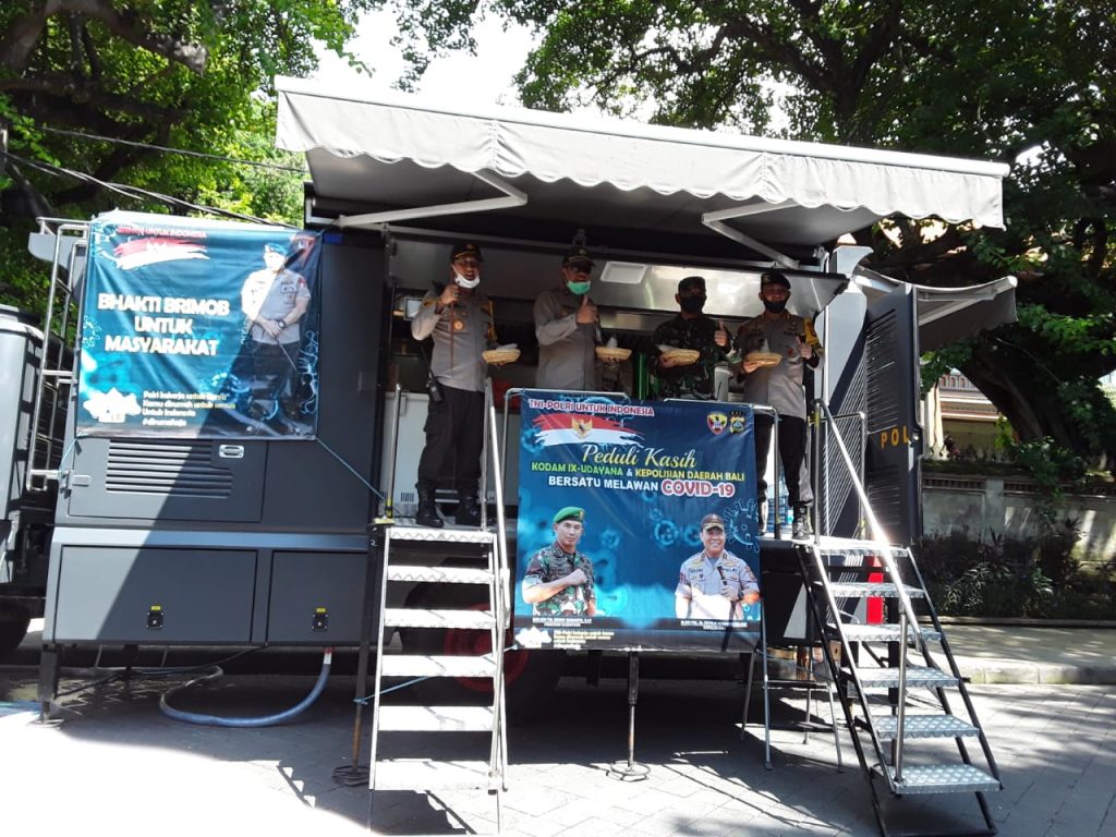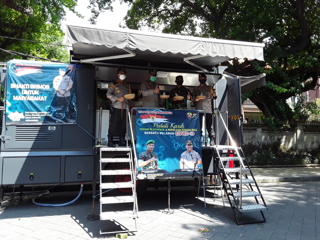 Denpasar, Lintasbali.com – Polda Bali bekerja sama dengan Kodam IX Udayana bersatu melawan Covid 19 melalui kegiatan peduli kasih yaitu bagi-bagi 1000 nasi bungkus kepada tukang parkir, orang tua, sopir angkot, tukang ojek, tukang suun (tukang jinjing) di seputaran Kota Denpasar, Selasa (14/4).