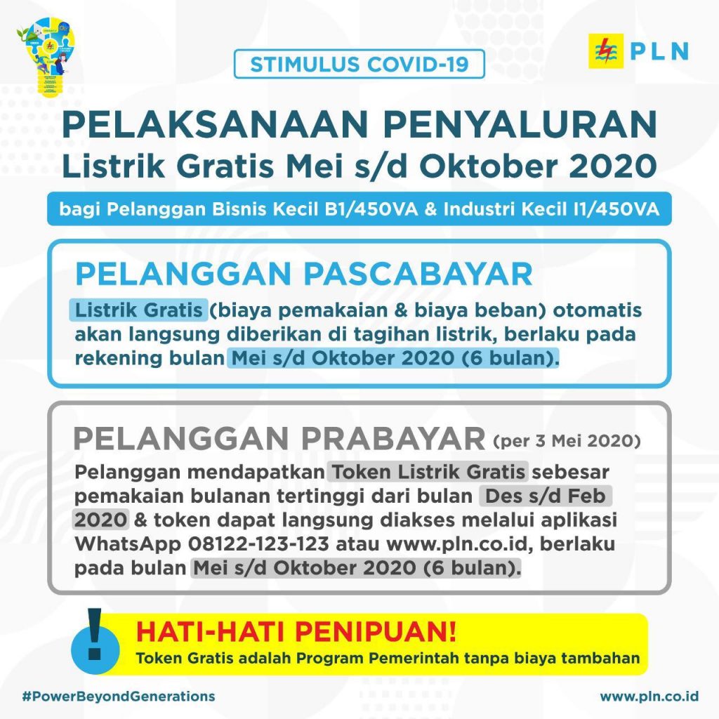 Ia menambahkan, untuk pelanggan bisnis dan industri 450 VA pascabayar, secara otomatis tagihan untuk pemakaian pada rekening bulan Mei sampai dengan Oktober adalah nol rupiah. Sedangkan untuk pelanggan yang menggunakan token listrik, token gratis tersebut dapat diperoleh baik melalui web yakni www.pln.co.id maupun aplikasi Whatsapp ke nomor 0812-2-123-123.