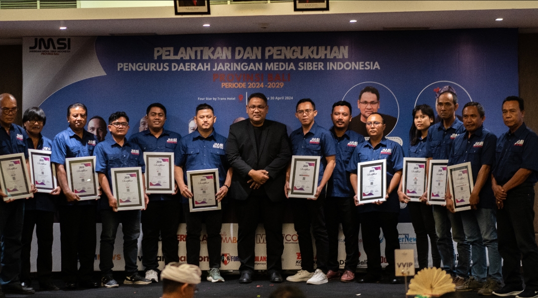 DENPASAR, lintasbali.com – Pengurus Daerah (Pengda) Jaringan Media Siber Indonesia (JMSI) Provinsi Bali periode 2024-2029 resmi dilantik dan dikukuhkan pada Selasa, 30 April 2024 bertempat di Four Star by Trans Hotel Denpasar. Pelantikan dan pengukuhan dihadiri langsung oleh Teguh Santosa, Ketua Umum JMSI Pusat.