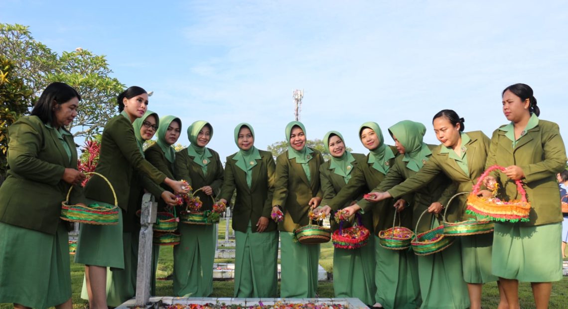 TABANAN, LintasBali.com – Dalam rangka memperingati Hari Ulang Tahun (HUT) Persit, Persit Kartika Chandra Kirana (KCK) ke-77 Tahun 2023, jajaran Persit KCK PD IX/Udayana melaksanakan ziarah rombongan di Taman Makam Pahlawan (TMP) Pancaka Tirta Tabanan, Banjar Taman Sari Desa Delod Peken Kecamatan Tabanan, Kabupaten Tabanan pada Jumat, 31 Maret 2023.