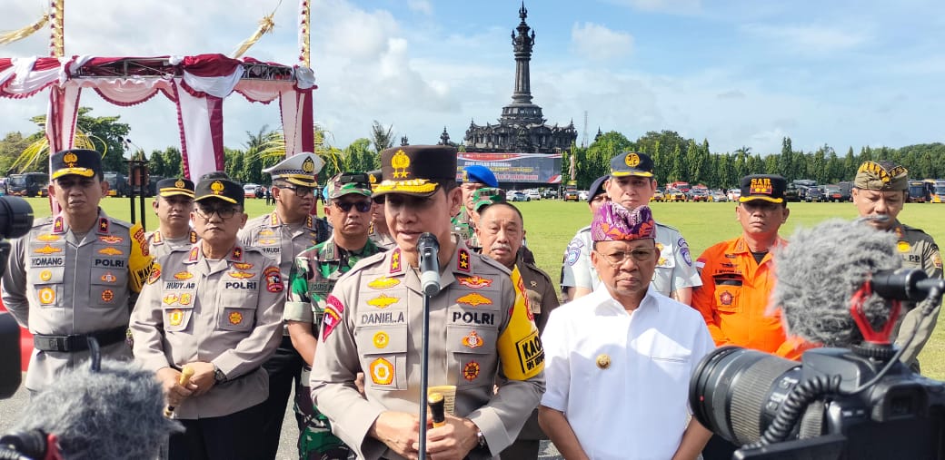 DENPASAR, lintasbali.com – Saat doorstop didepan para awak media setelah pelaksanaan gelar pasukan Ops Ketupat Agung-2025 dilapangan niti mandala renon Denpasar Kamis, 20 Maret 2025, Kapolda Bali Irjen Pol Daniel Adityajaya S.I.K., M.Si., didampingi Gubernur Bali Ir. Wayan Koster M.M., Waka Polda Brigjen Pol I Komang Sandi Arsana S.I.K., M.H., serta Forkopimda lainnya.