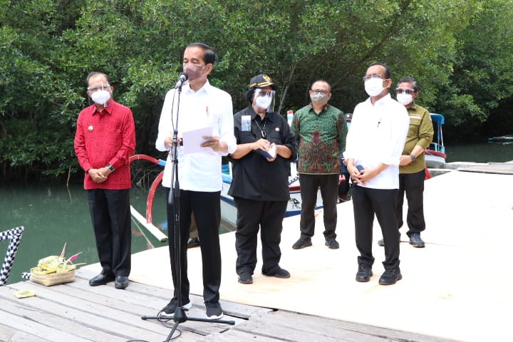 LINTASBALI.COM – Tiba di Bali, Presiden Joko Widodo dan Ibu Negara Iriana Joko Widodo bersama rombongan langsung meninjau hutan mangrove di Taman Hutan Raya Ngurah Rai, Kabupaten Badung pada Jumat pagi, 8 Oktober 2021.