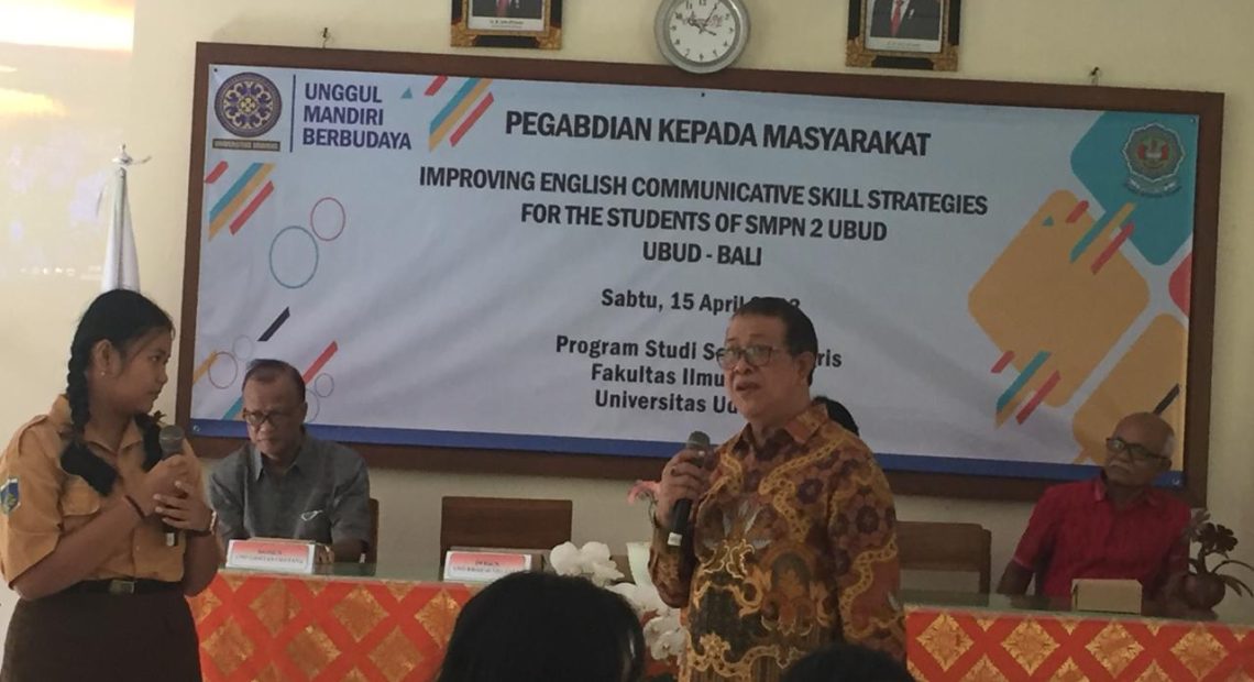 “Kami dari Program Studi Sastra Inggris ingin memberikan kesempatan kepada mahasiswa kami untuk melatih diri menyampaikan materi kepada adik-adiknya. Ini merupakan pengalaman yang sangat berharga bagi mereka. Kami berharap kontribusi kami dapat memberikan manfaat bagi adik-adik di SMPN 2 Ubud. Selain itu, ke depannya kami berharap agar kepala sekolah SMP lain di Kabupaten Gianyar dapat memberikan waktu kepada kami untuk melaksanakan kegiatan serupa”, ungkap Prof.Sedeng.